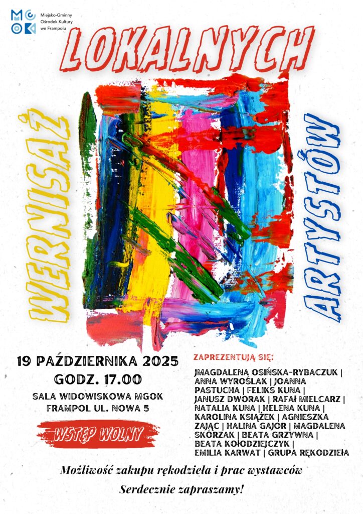 Zapraszamy na Wernisaż Lokalnych Artystów 19.10.2025 o godzinie 17:00 w Miejsko-Gminnym Ośrodku Kultury we Frampolu.