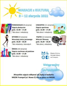 „Wakacje z kulturą” „Wakacje z kulturą” All day 8 sierpnia 2022 – 12 sierpnia 2022 Read more Zobacz cały kalendarz